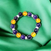 紫、黄色の天然石を使用した美しい色合いのブレスレットです。透明なクリスタルビーズがアクセントとなり、全体のデザインを引き立てています。