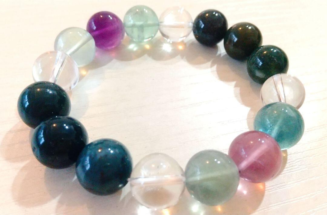 フローライト・モスグリーンアゲート・水晶の天然石ブレスレット!内径15.5cm±5㎜☆彡